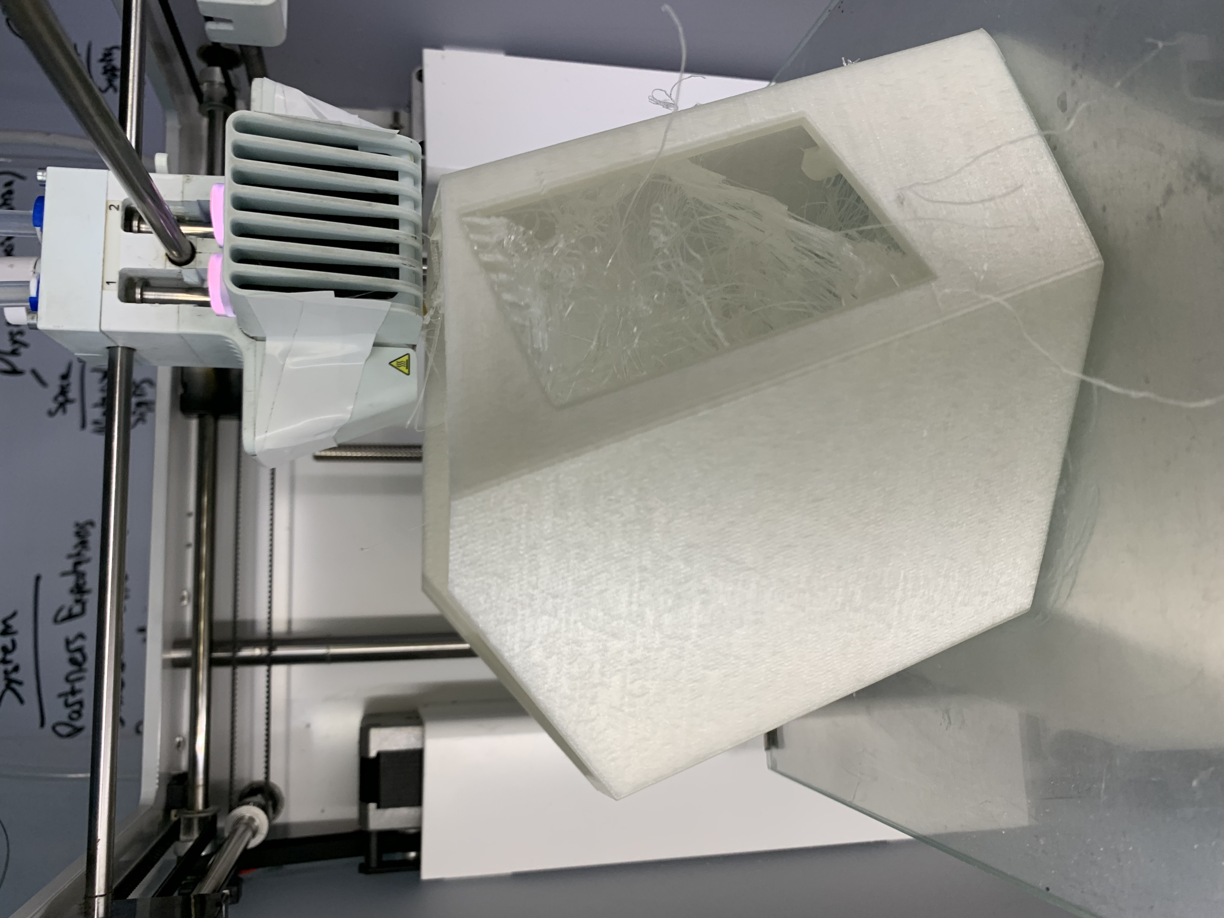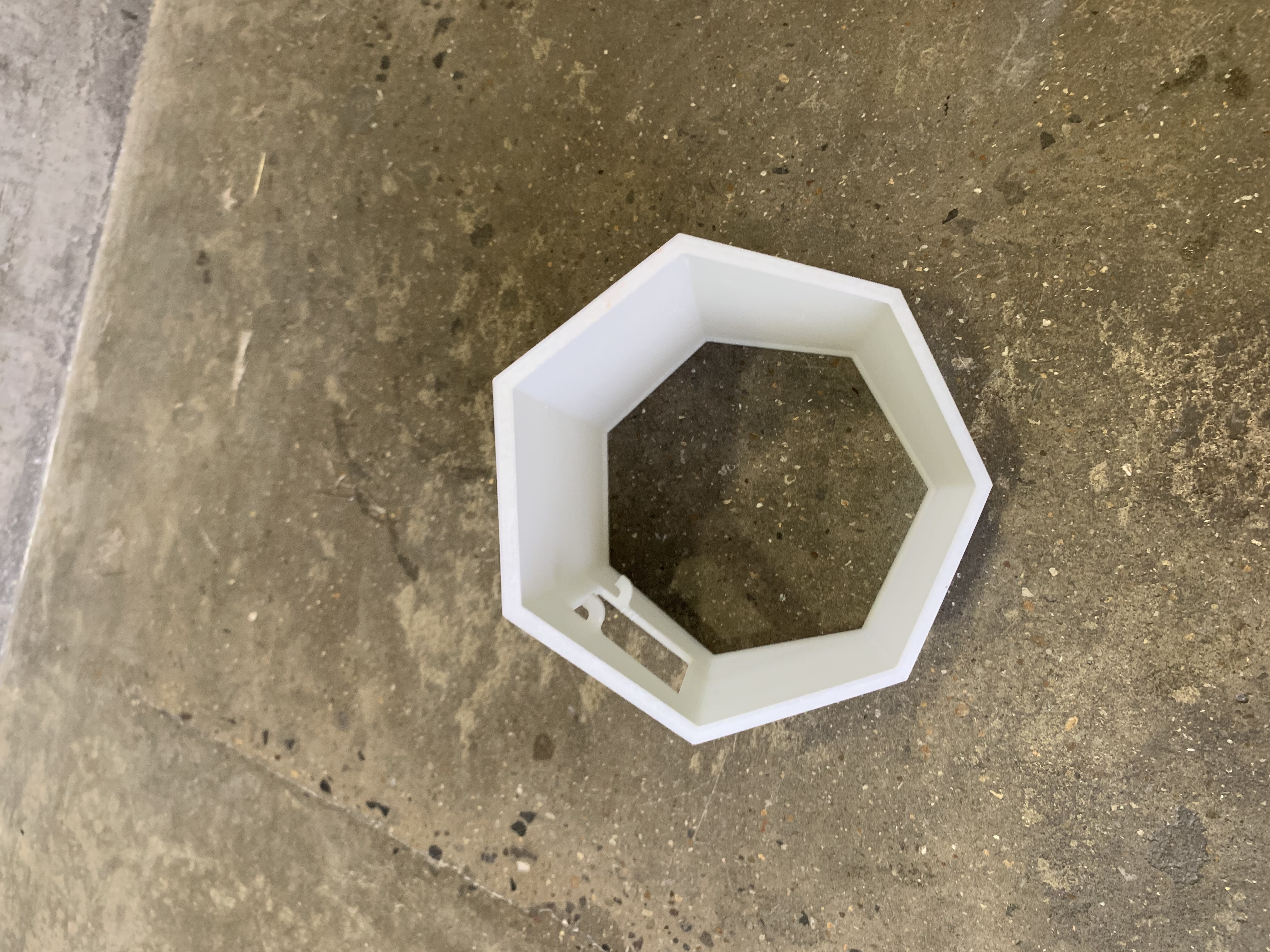 A geometric, donut-shaped piece that was 3D printed using recycled PLA that glows in the dark. It has 9 opening doors to connect the fabric tentacles with ports, which spin thanks to a network of engines and batteries. Their revolution allows fabric to move up and down.